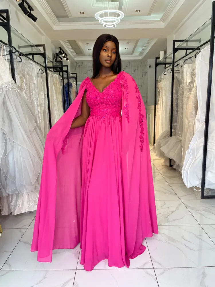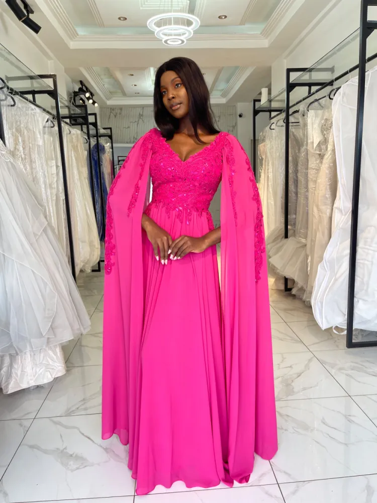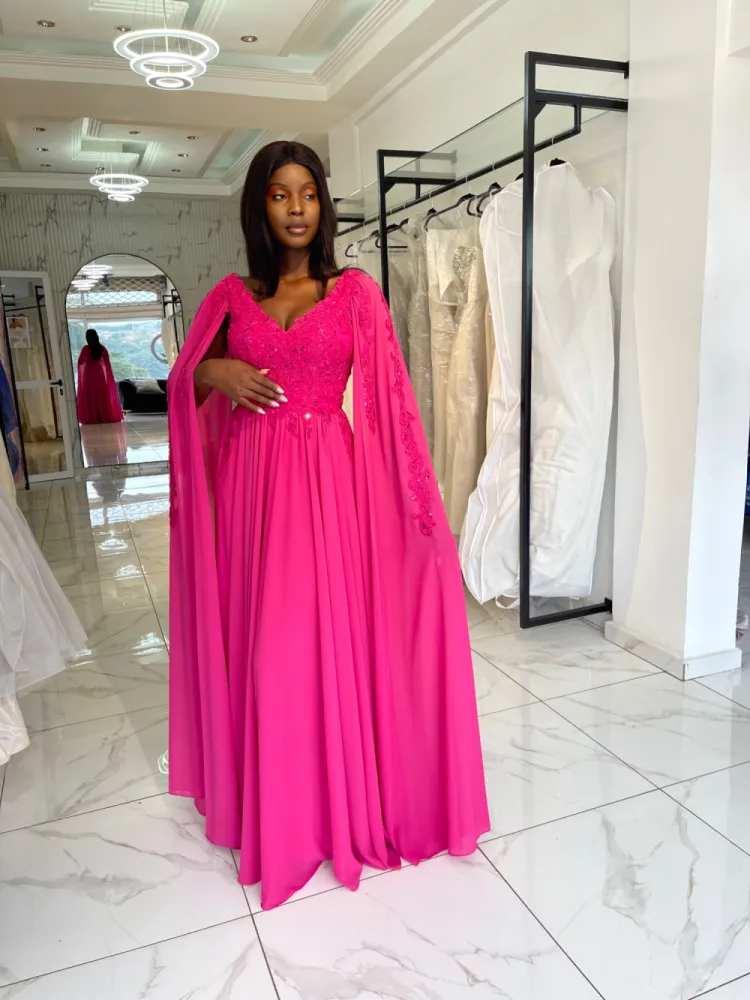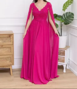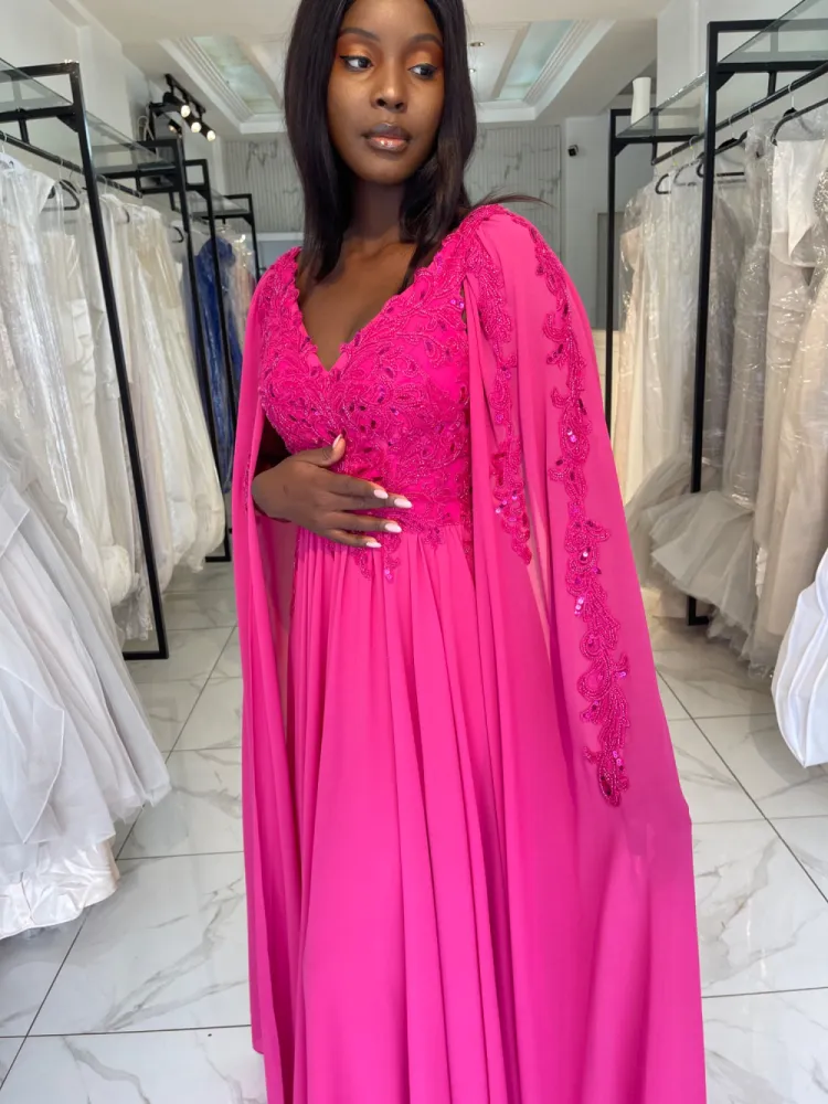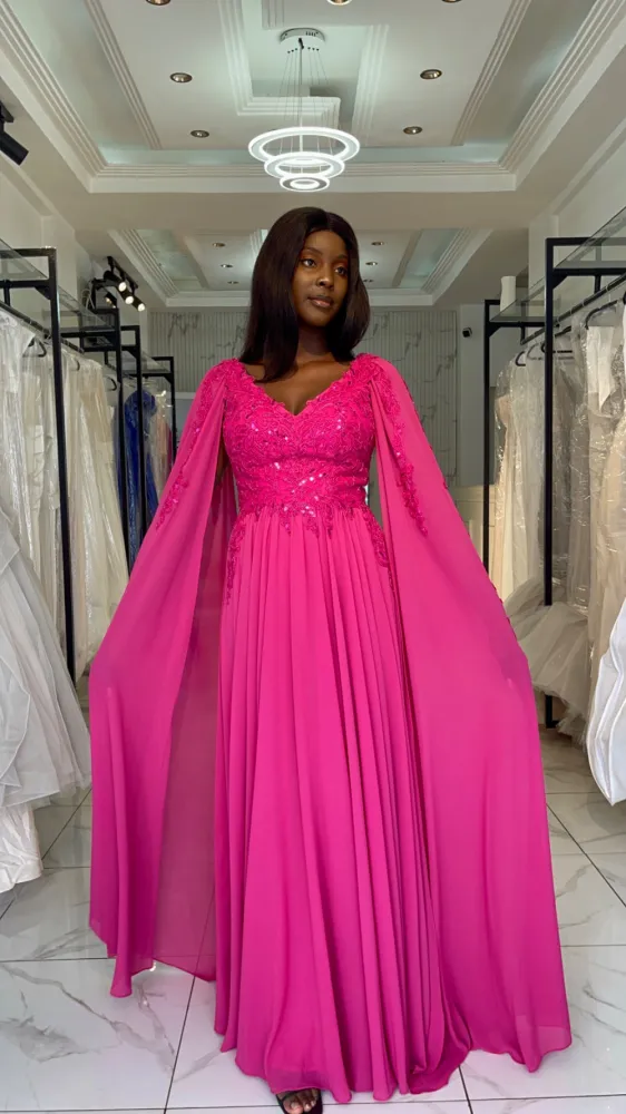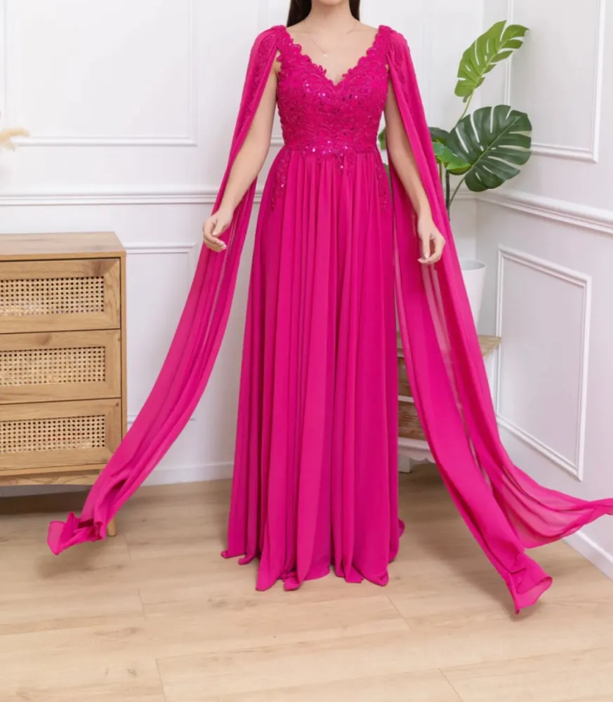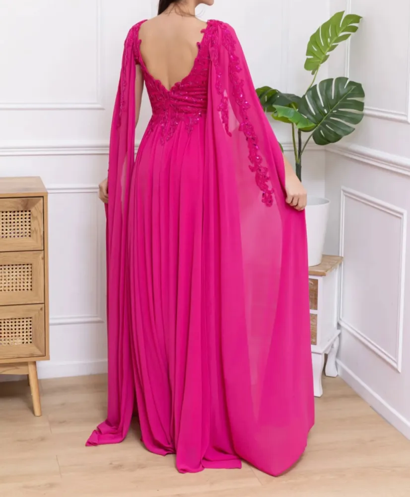 Robe rose fuschsia longue cocktail , avec manches fantaisie volante avec strass