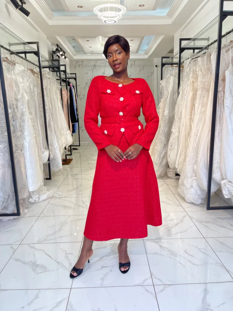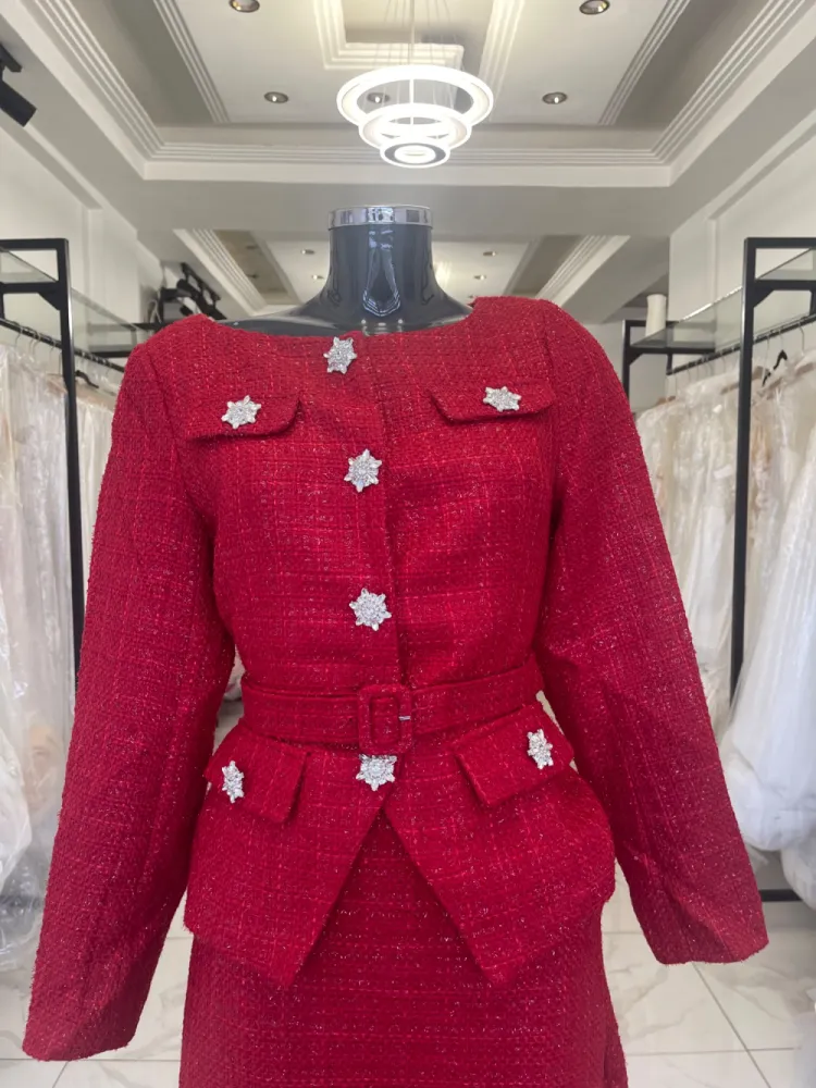 Veste en tweed rouge avec strass sur boutons à pression et ceinture