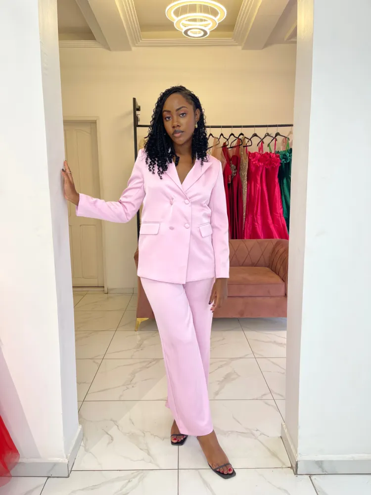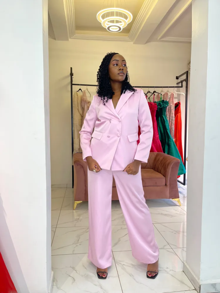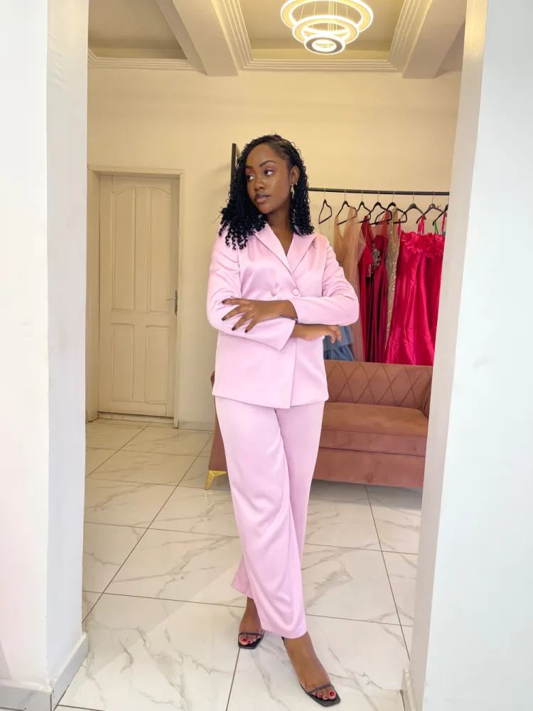 Ensemble veste à 4 boutons + pantalon satinée rose