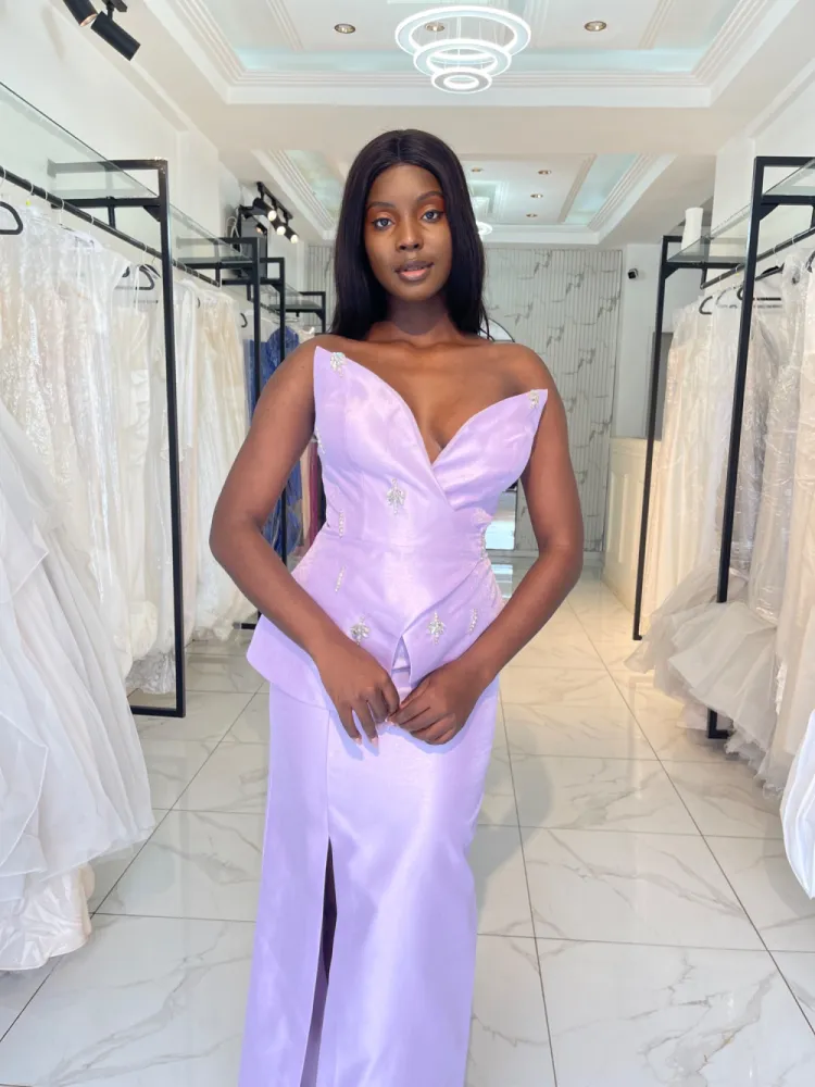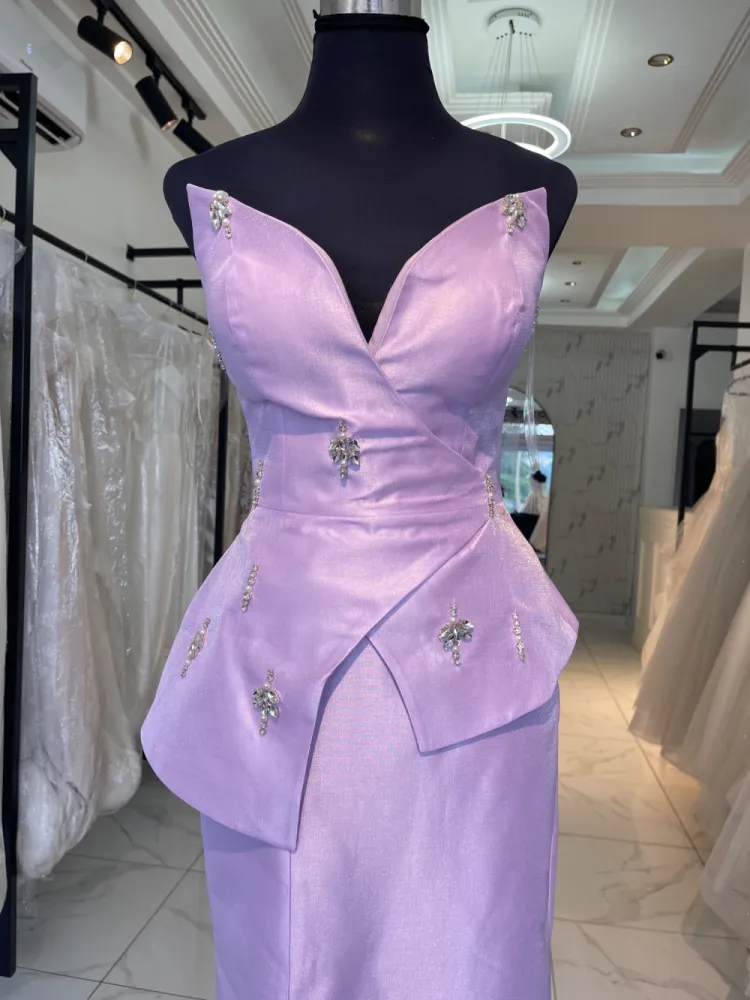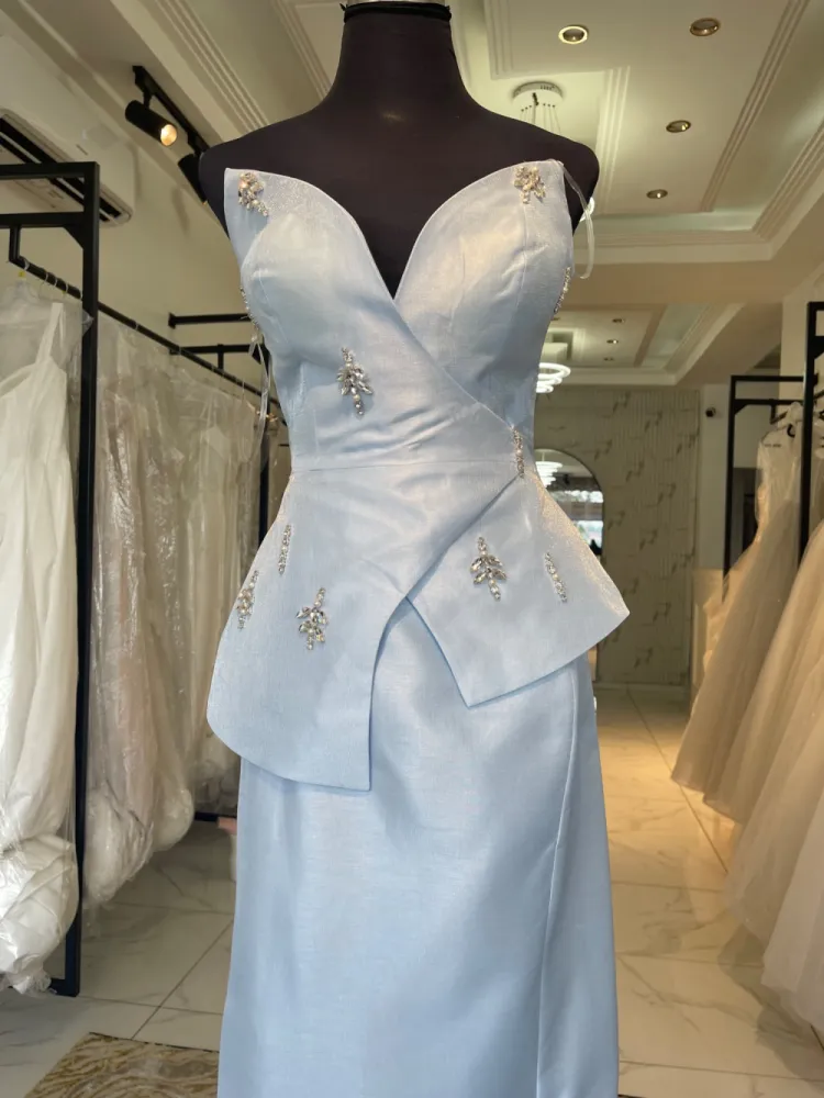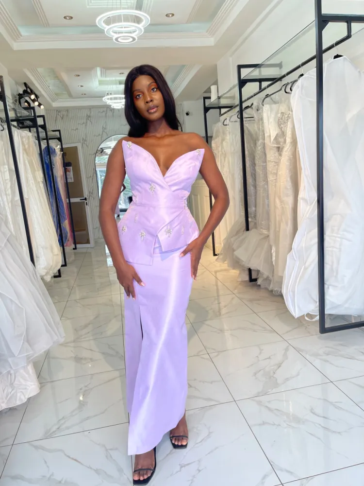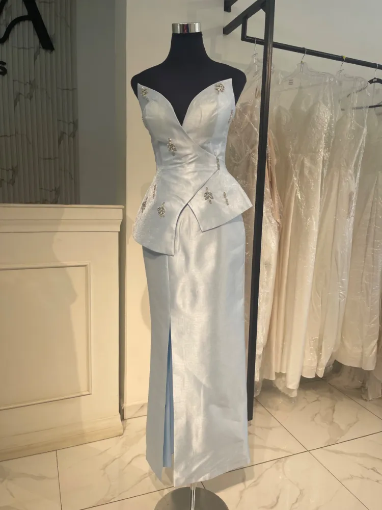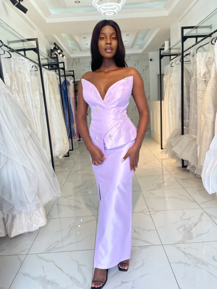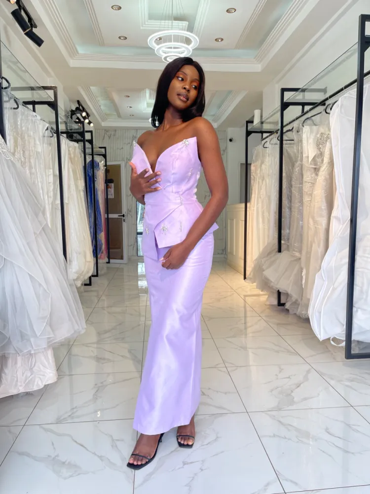 Ensemble top en bustier avec strass en fleurs et jupe droite avec fente