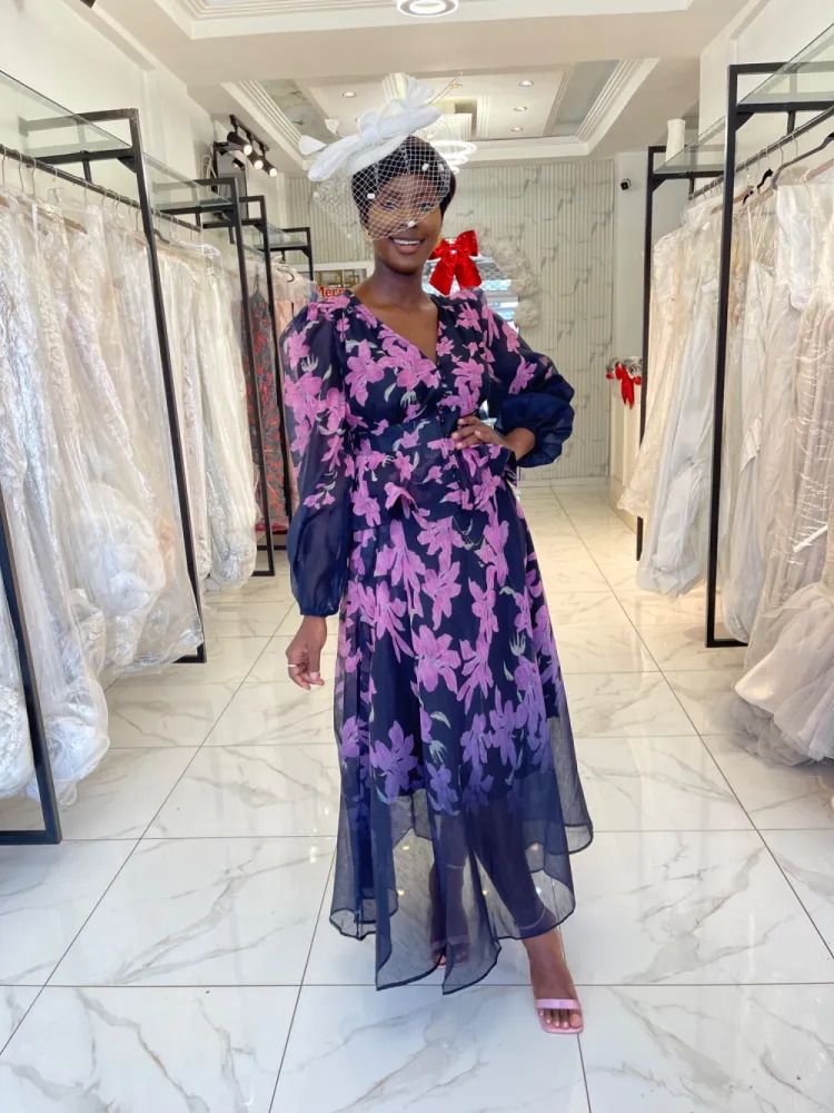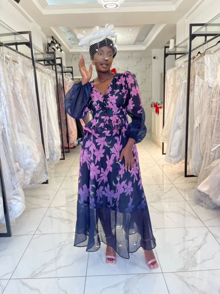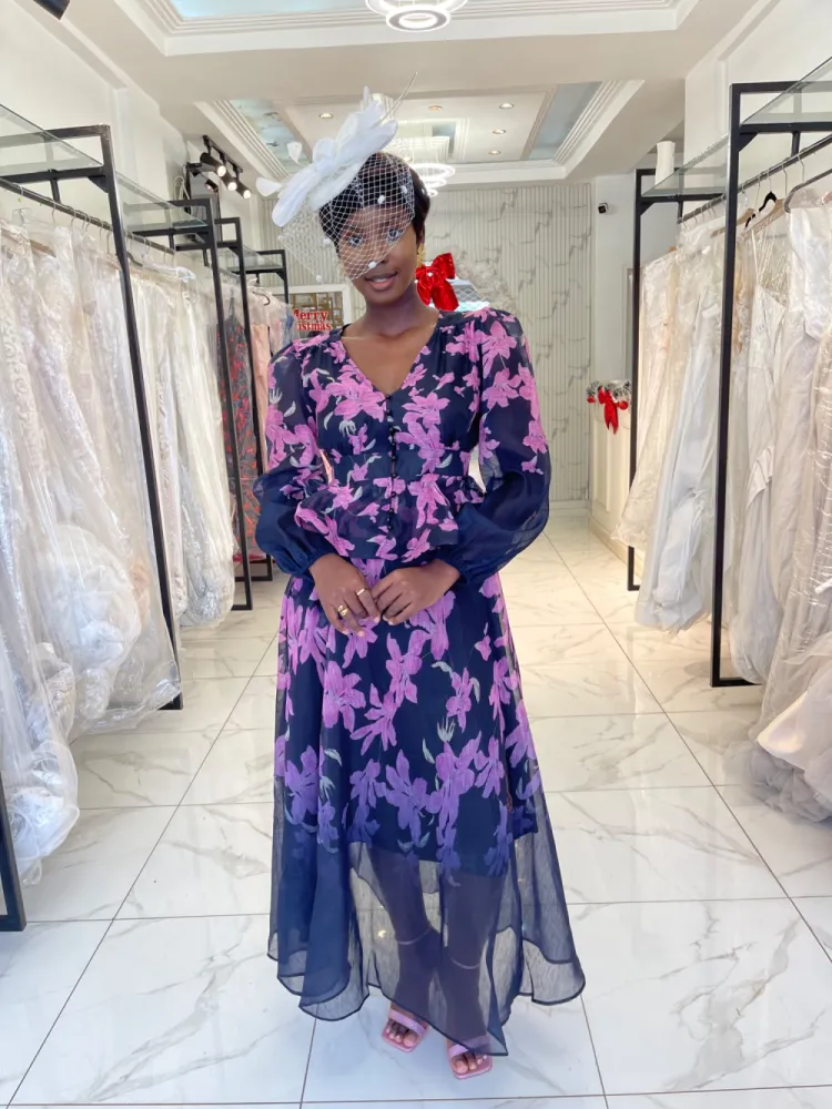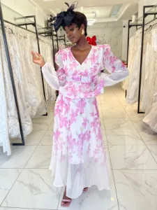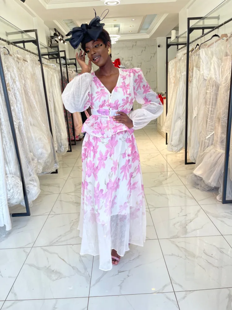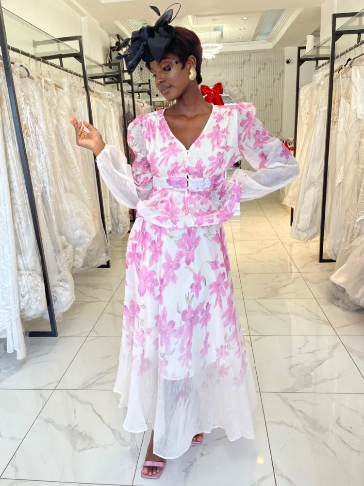 Ensemble top effet évasé avec des boutons en perles et une jupe évasée fleurie rosée , sur fond noire / beige