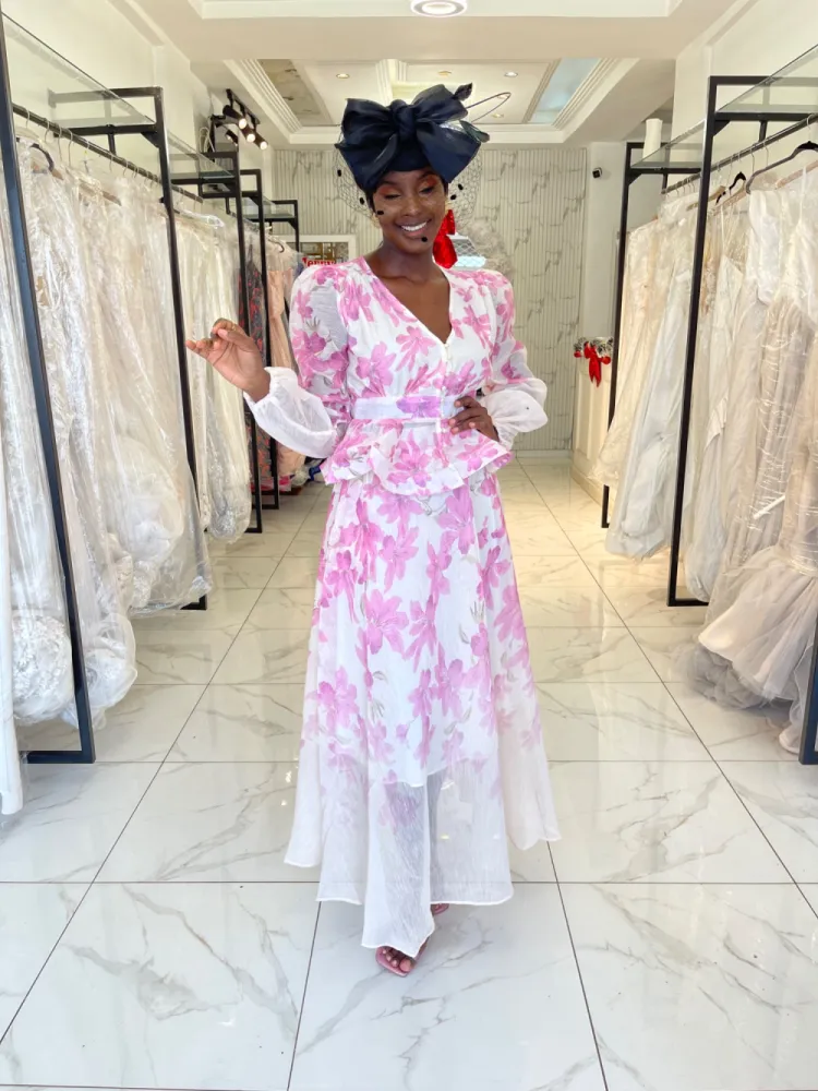 Ensemble top effet évasé avec des boutons en perles et une jupe évasée fleurie rosée , sur fond noir...