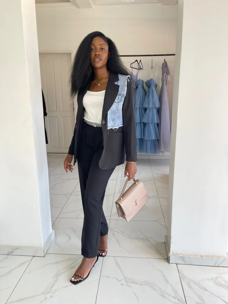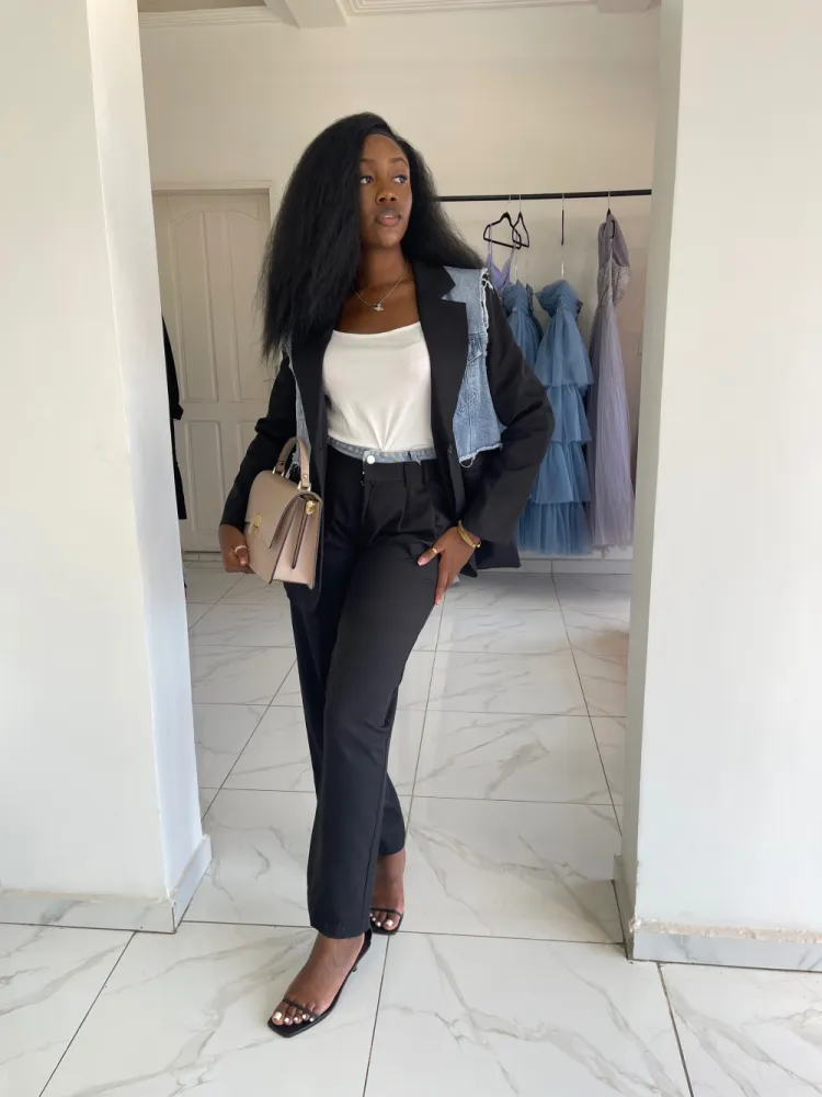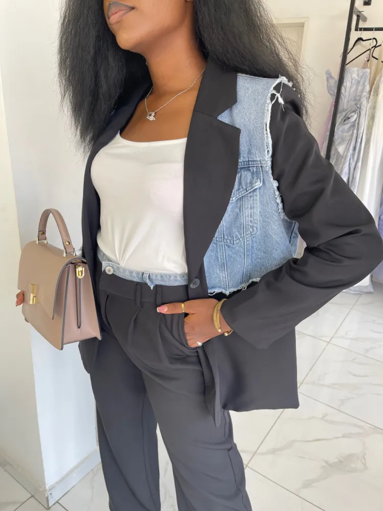 Veste + pantalon recouvert légèrement de jeans pour un effet décontracté