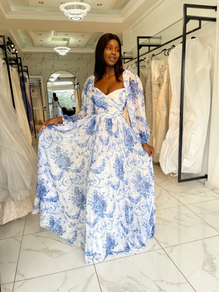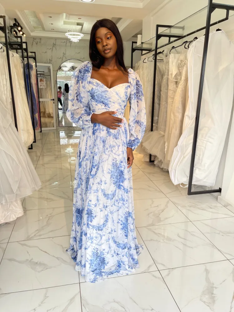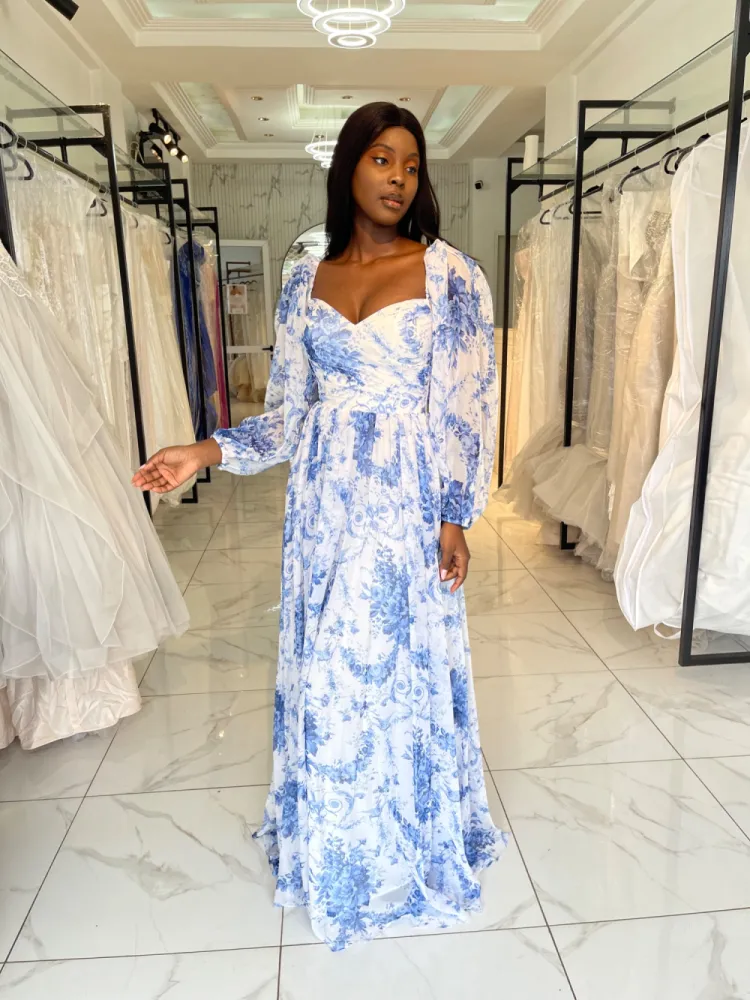 Robe longue fleurie bleu Avec longues manches