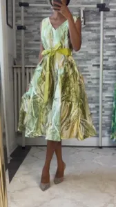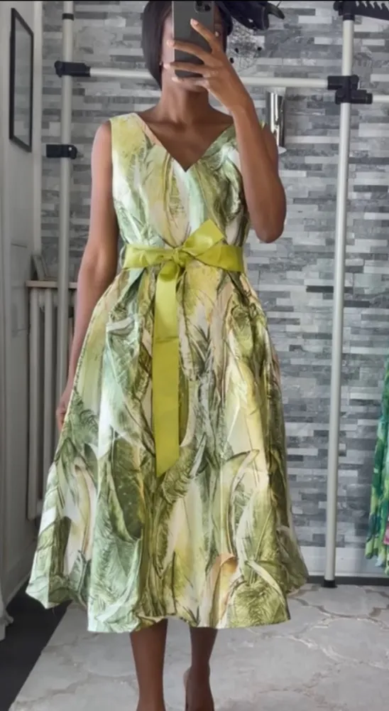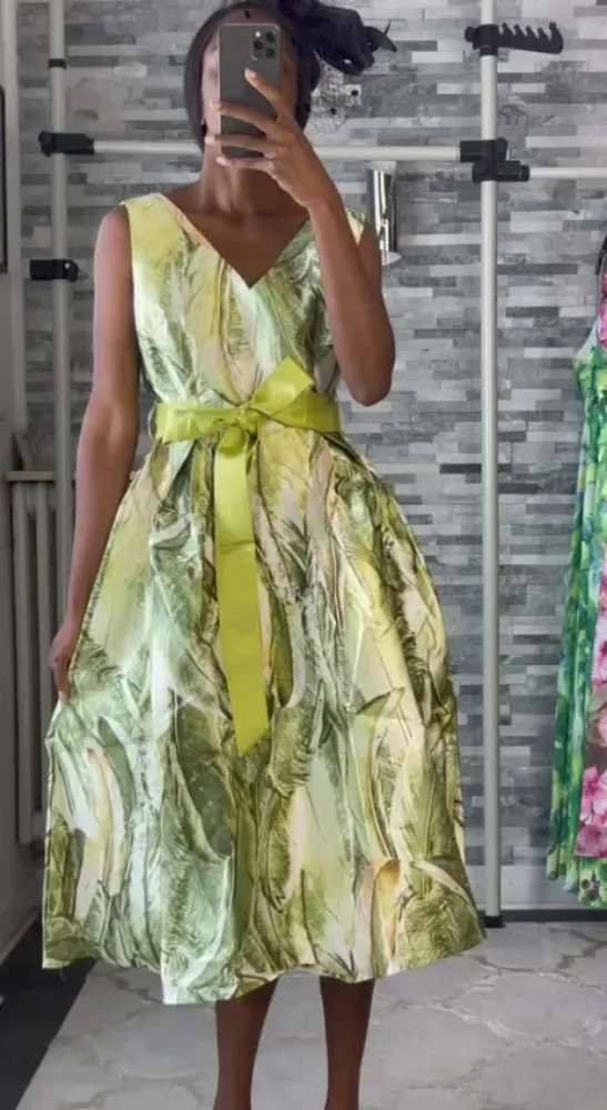 Robe midi sans manche motif vert avec ceinture à nouer...