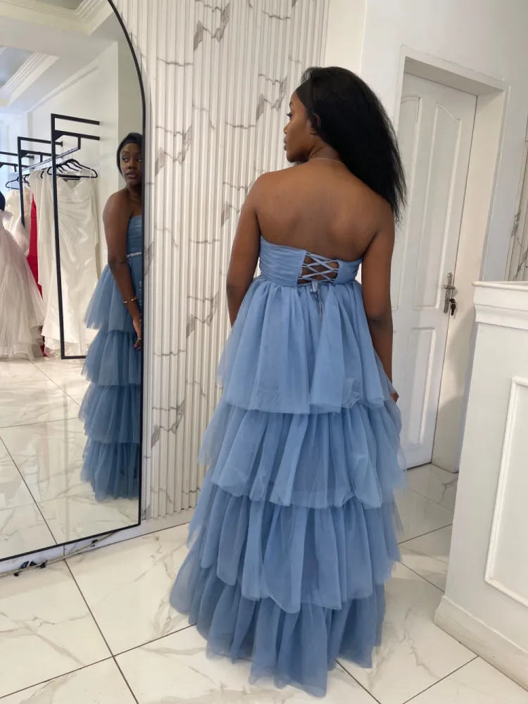 Robe couleur bleu turquoise ouverture a l’avant et longue en arrière,bustier ajustable