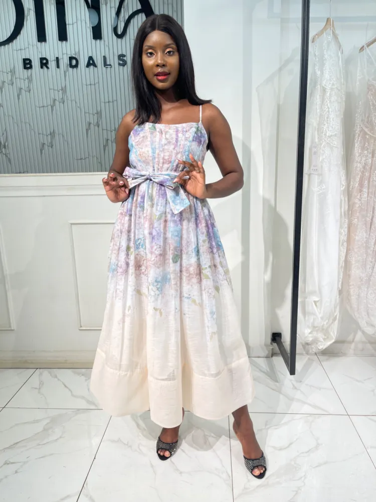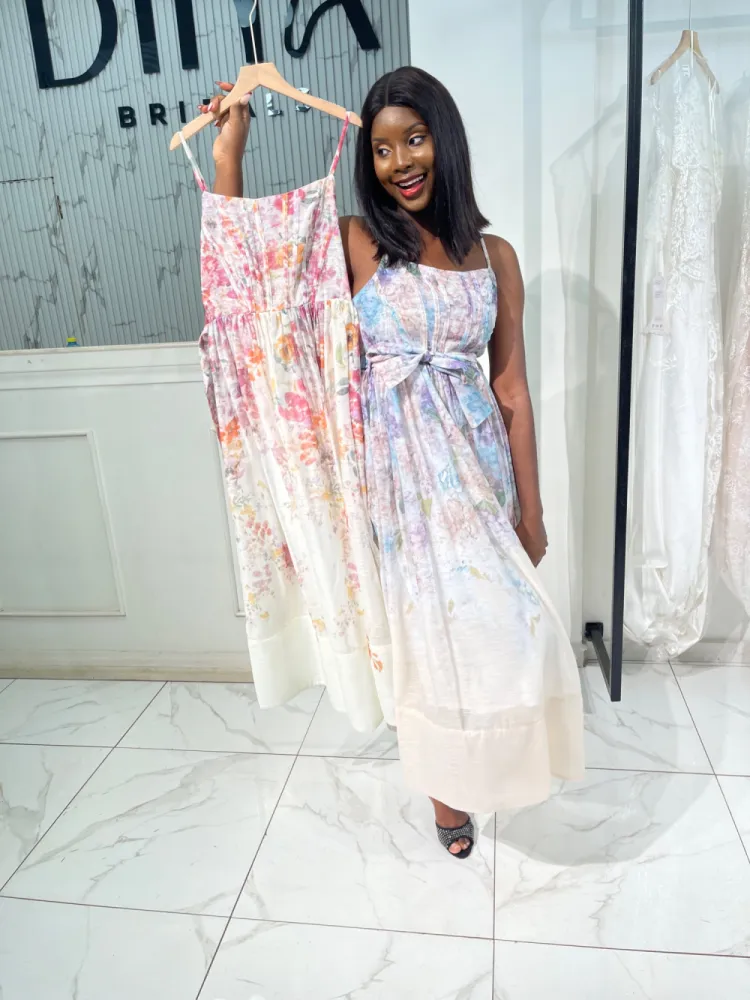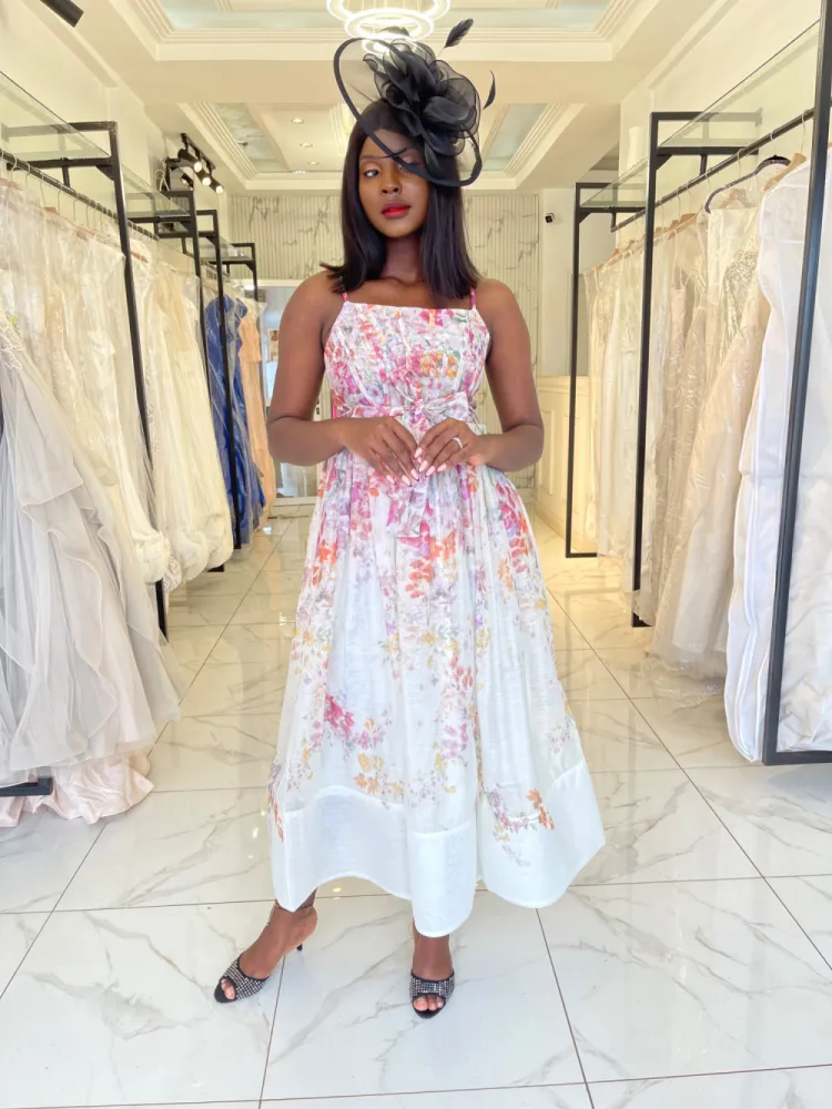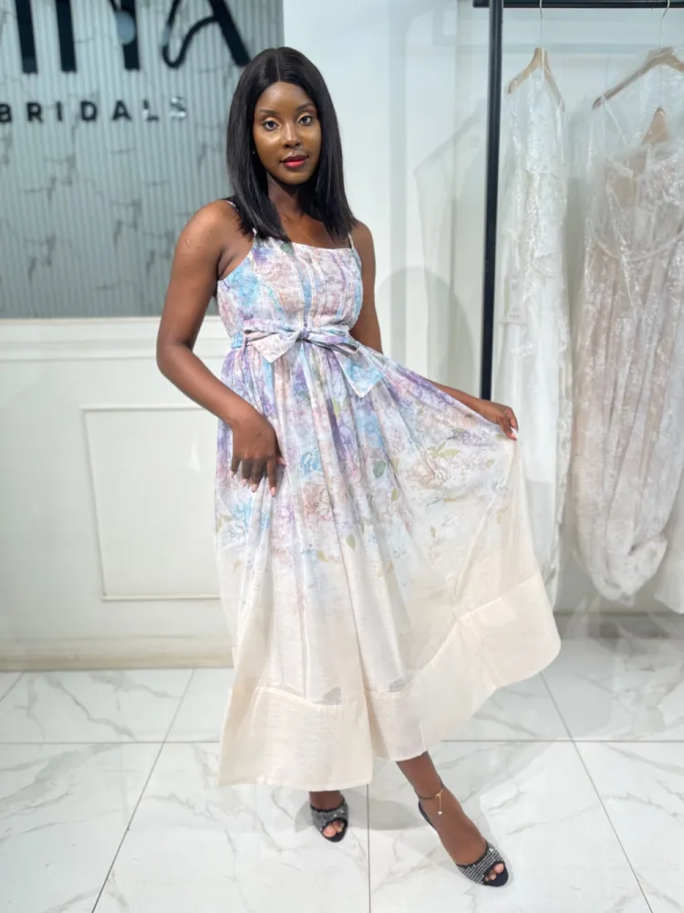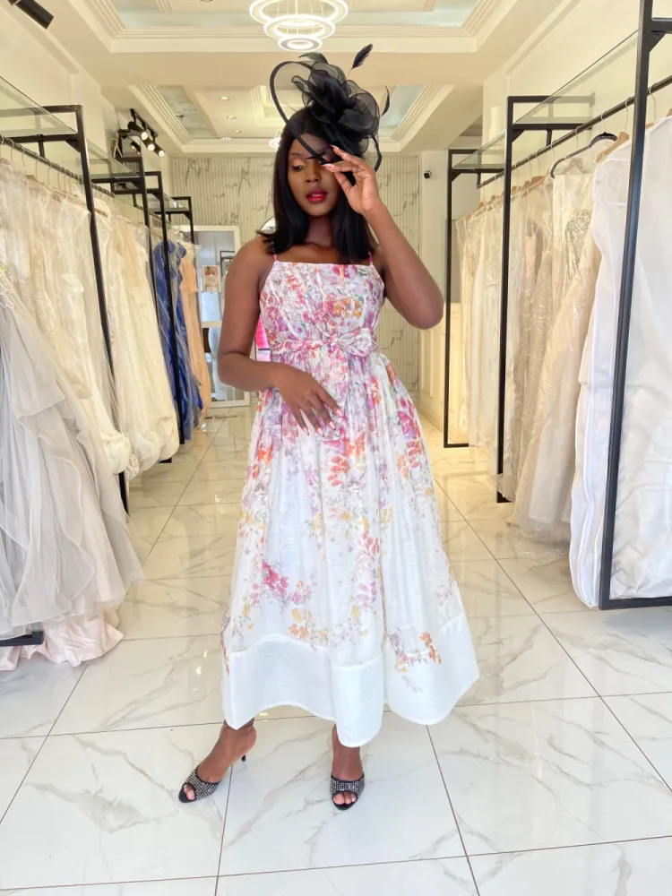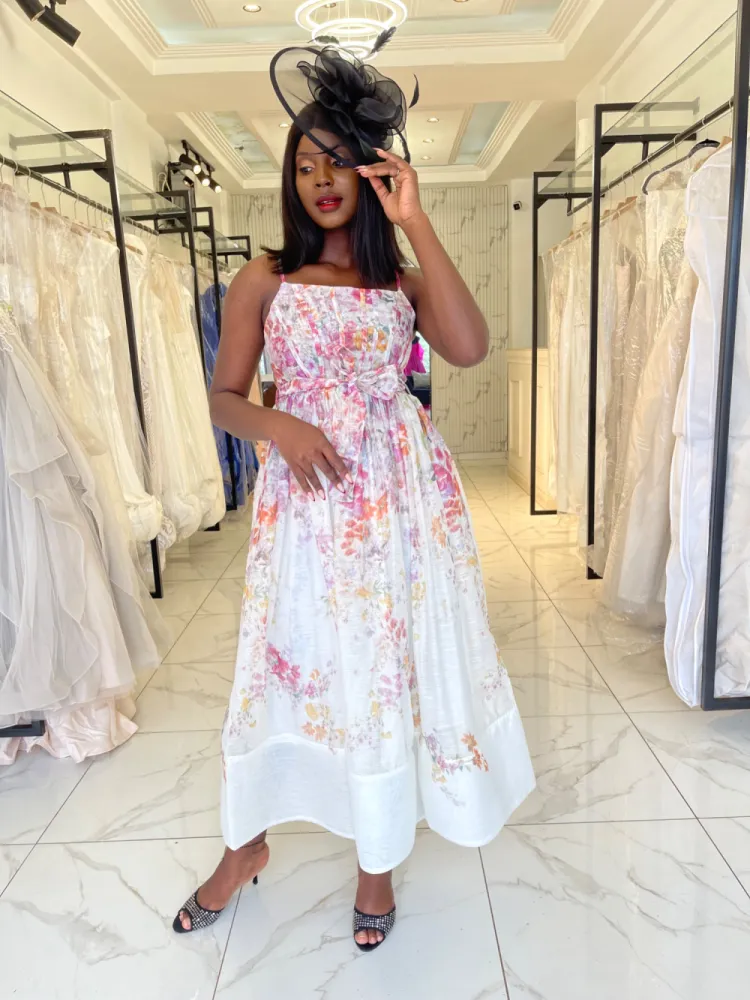Robe à bretelle fleurie longue avec ceinture Couleur beige et blanc