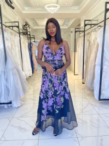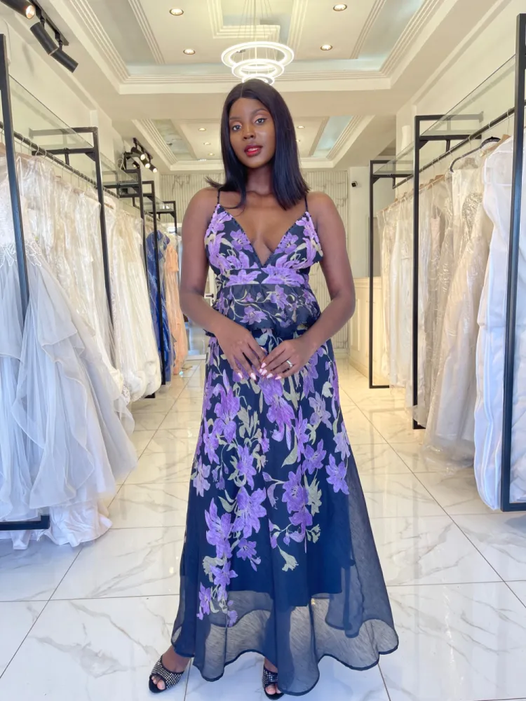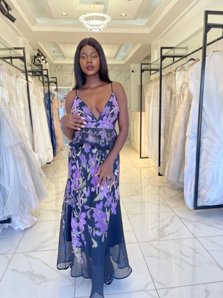 Robe à bretelle strass ,longue couleur noire fleurie à motifs violacés