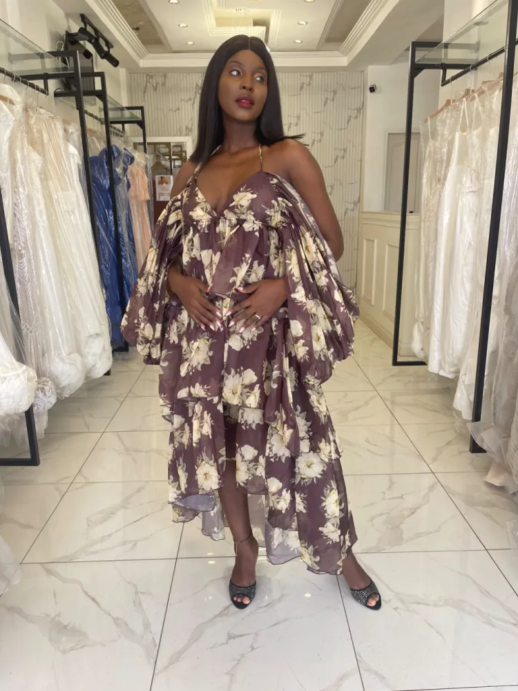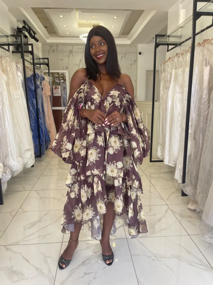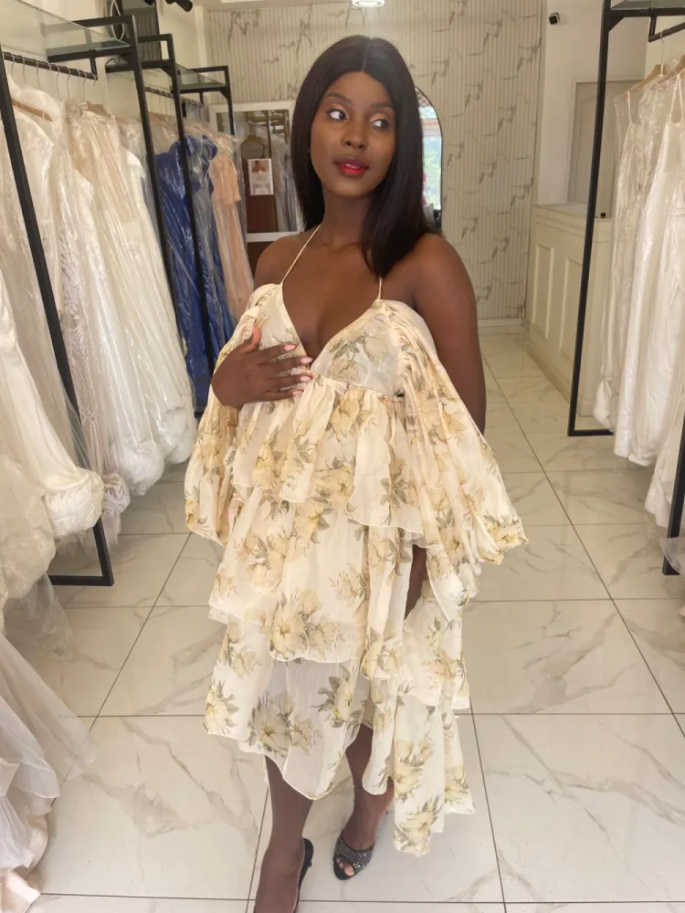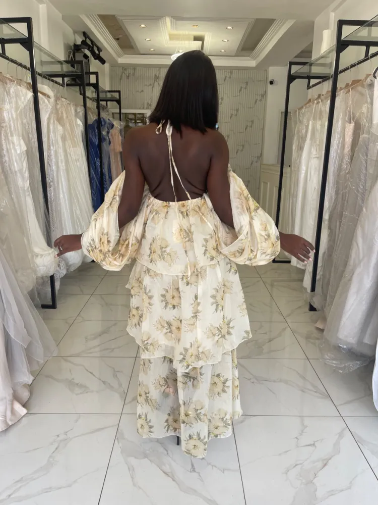 Robe col bateau à manche bouffante , dos nu , fleurie Coloris jaune et noire...