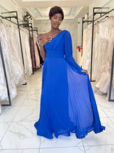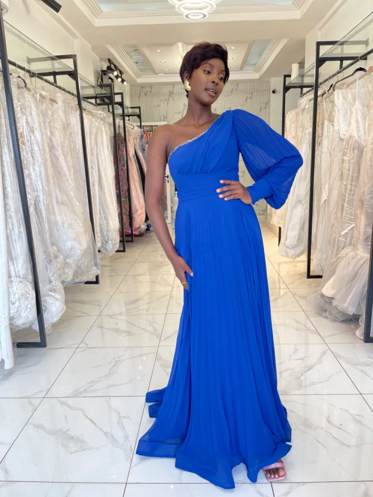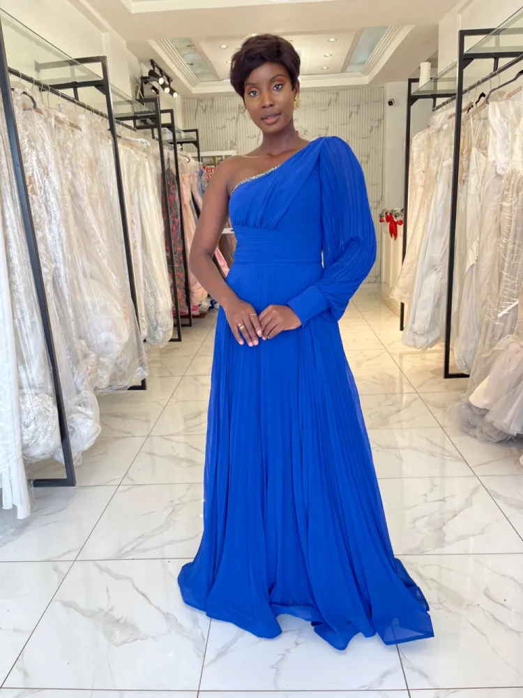 Robe longue bleu électrique, une manche plissée, col avec strass , bas plissé