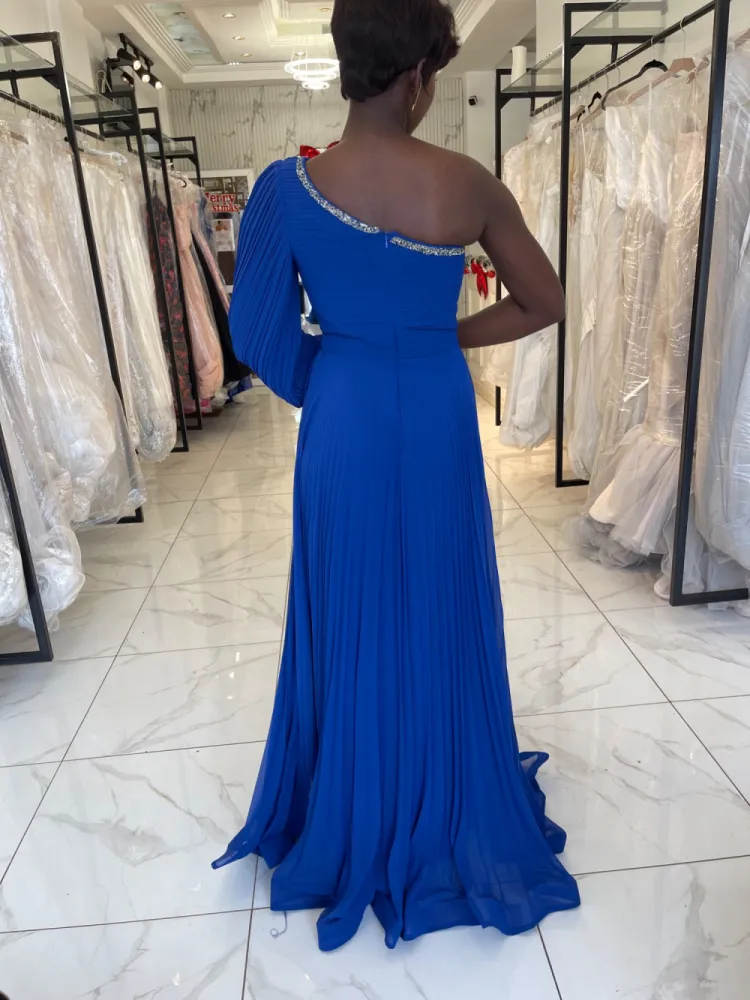 Robe longue bleu électrique, une manche plissée, col avec strass , bas plissé...