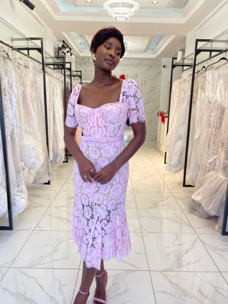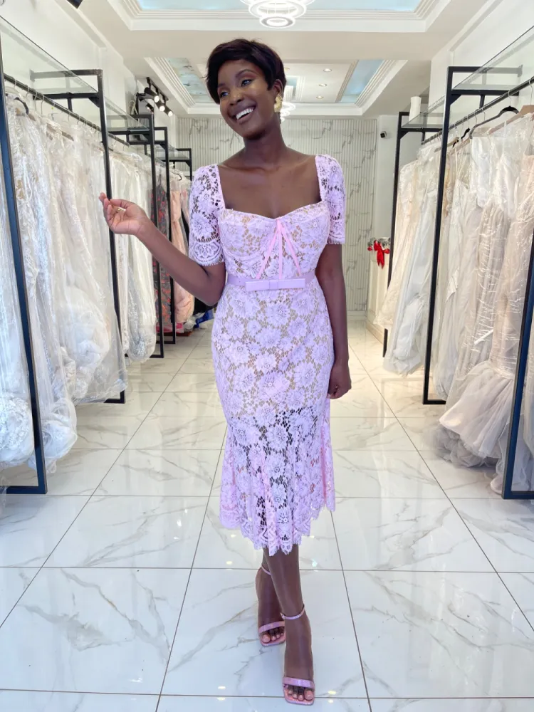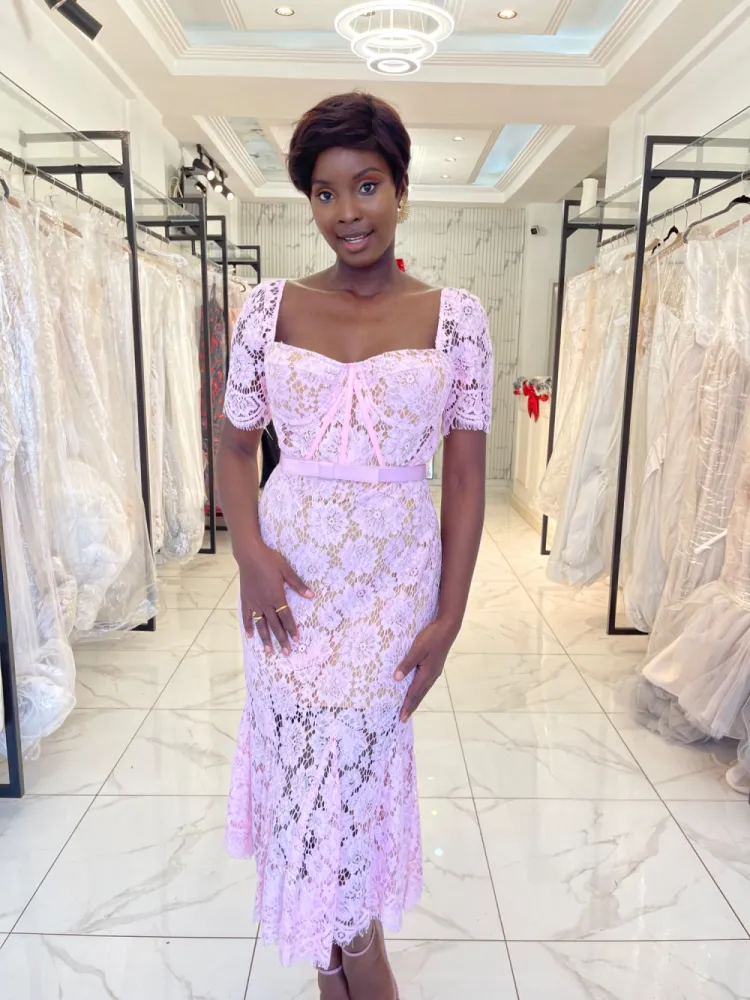 Robe midi en dentelle avec petites manches Noire/ rose