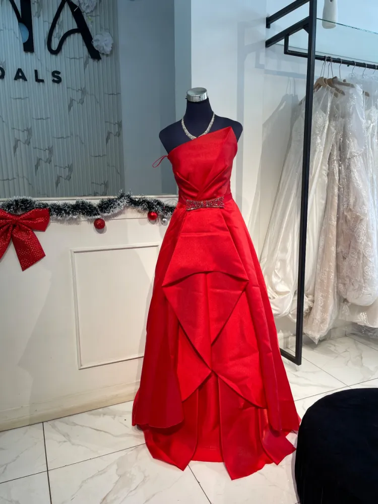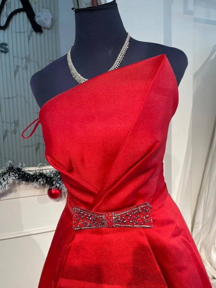Longue robe rouge en satin sans manches avec petite ceinture à strass...