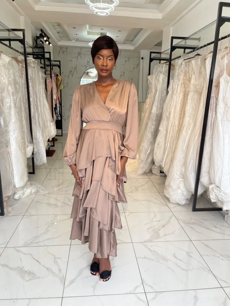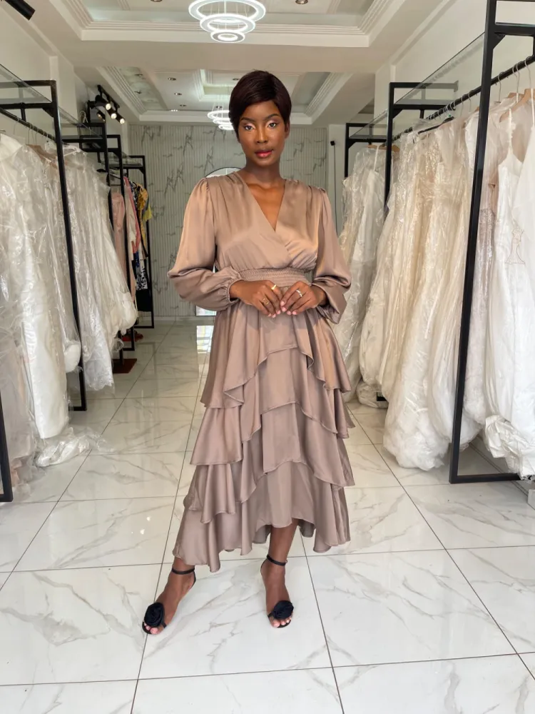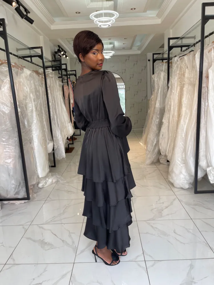 Robe longue satinée longues manches à étages Deux coloris noire /chocolat