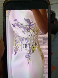 Robe blanche une manche avec details en broderie fleurie avec perles , coupe droite...