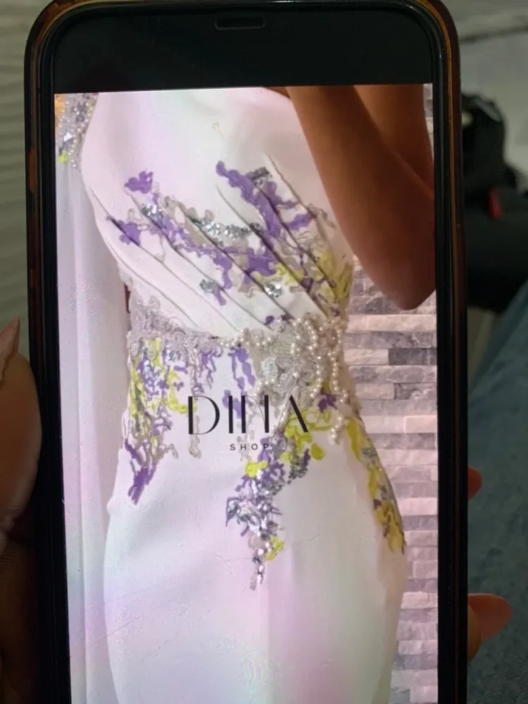 Robe blanche une manche avec details en broderie fleurie avec perles , coupe droite