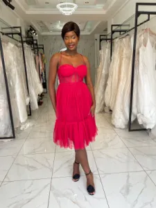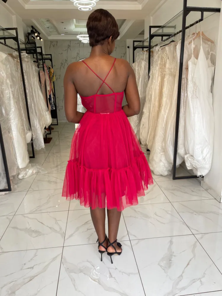 Robe mi genoux bordeau en tulle avec bretelles croisées dans le dos...