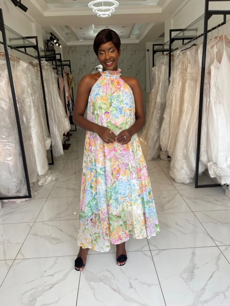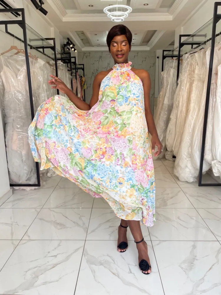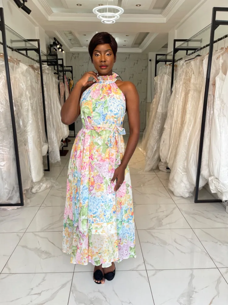 Robe fleurie longue avec col fermé et petite corde a nouer...