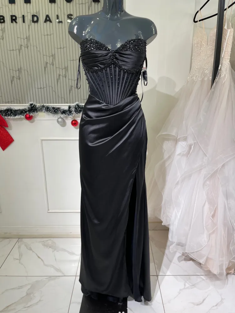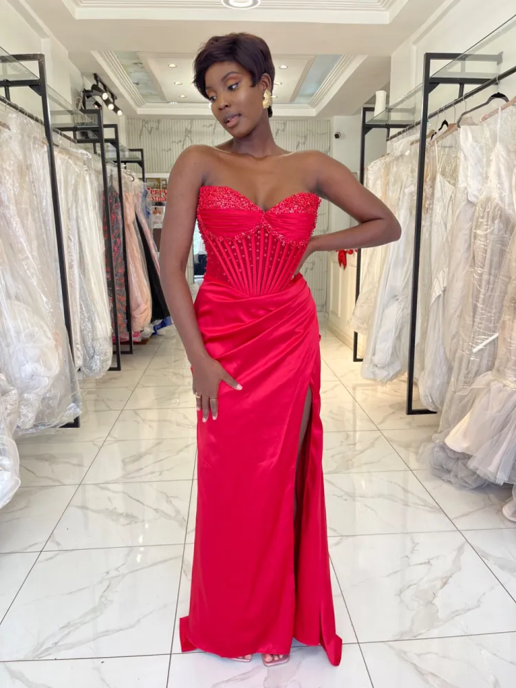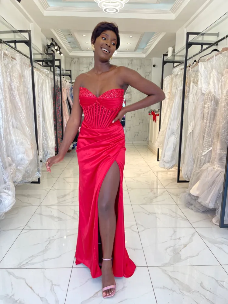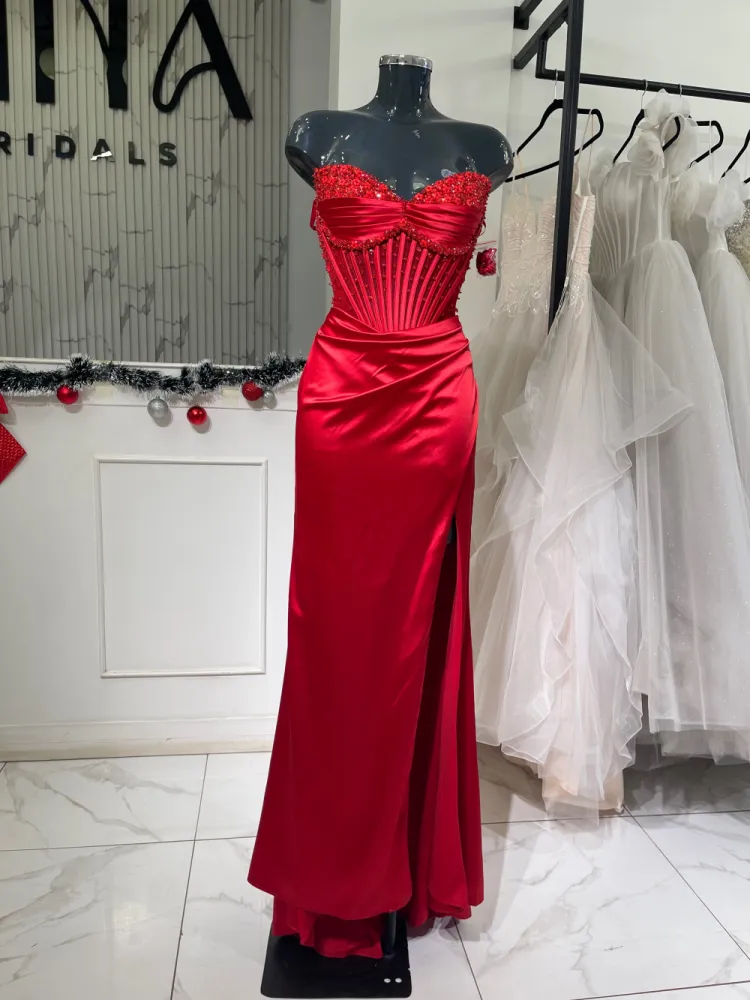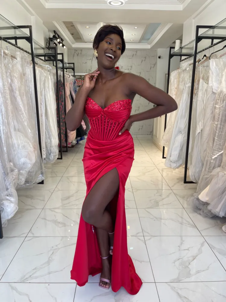 Robe de soirée rouge/noire bustier avec strass et perles et bas satinée. Se noue comme un corset à l’arrière