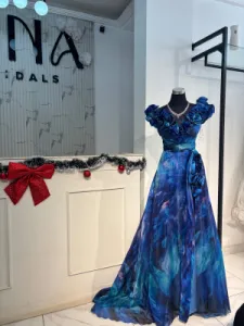 Longue robe bleu avec des fleur sur les manches et au niveau de la fente