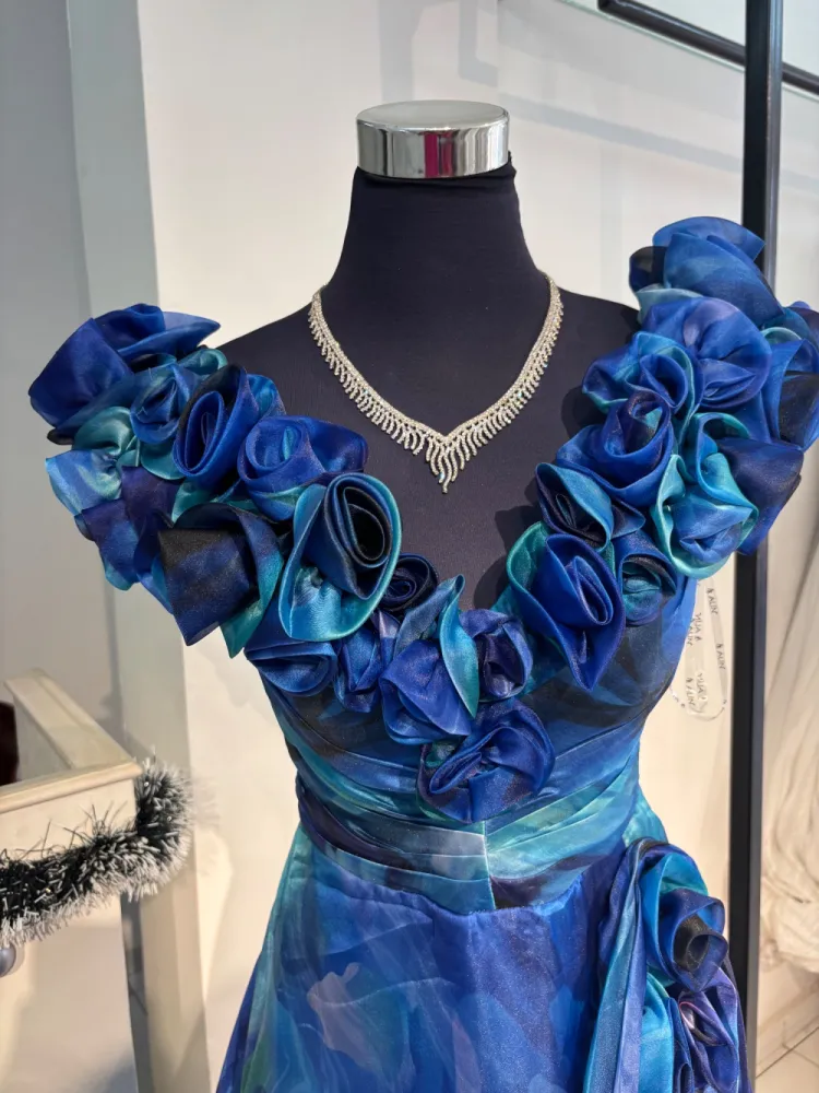 Longue robe bleu avec des fleur sur les manches et au niveau de la fente...
