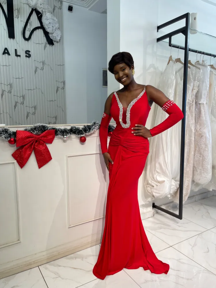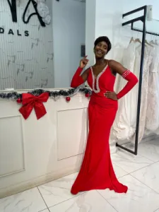 Robe rouge longue moulante avec manches détachables et strass sur le col