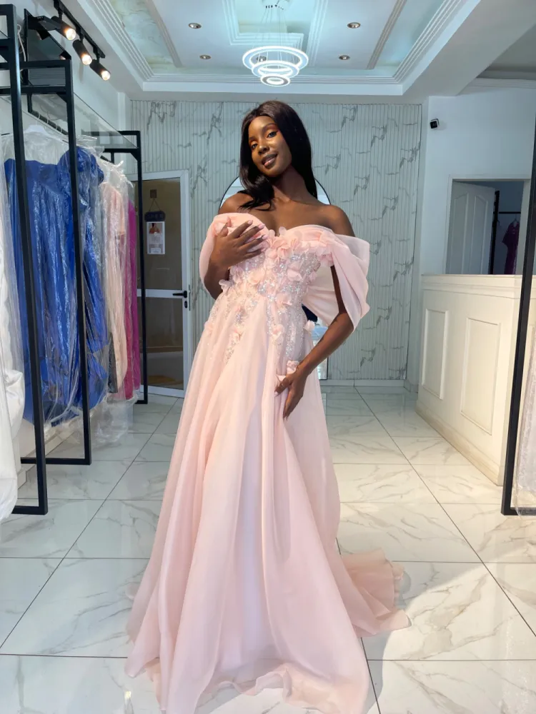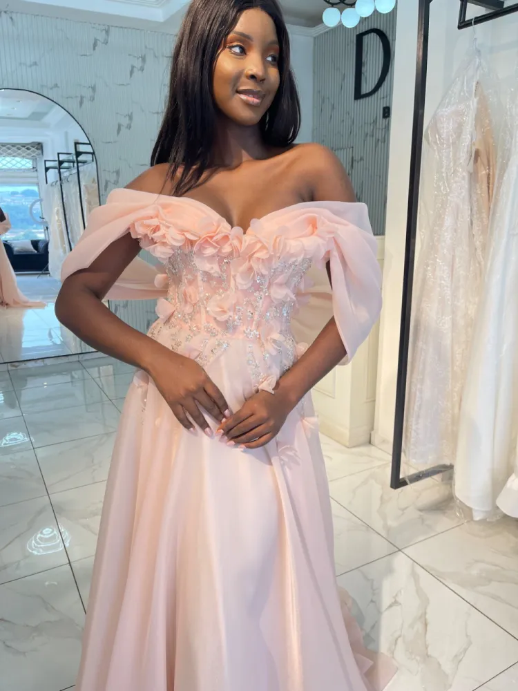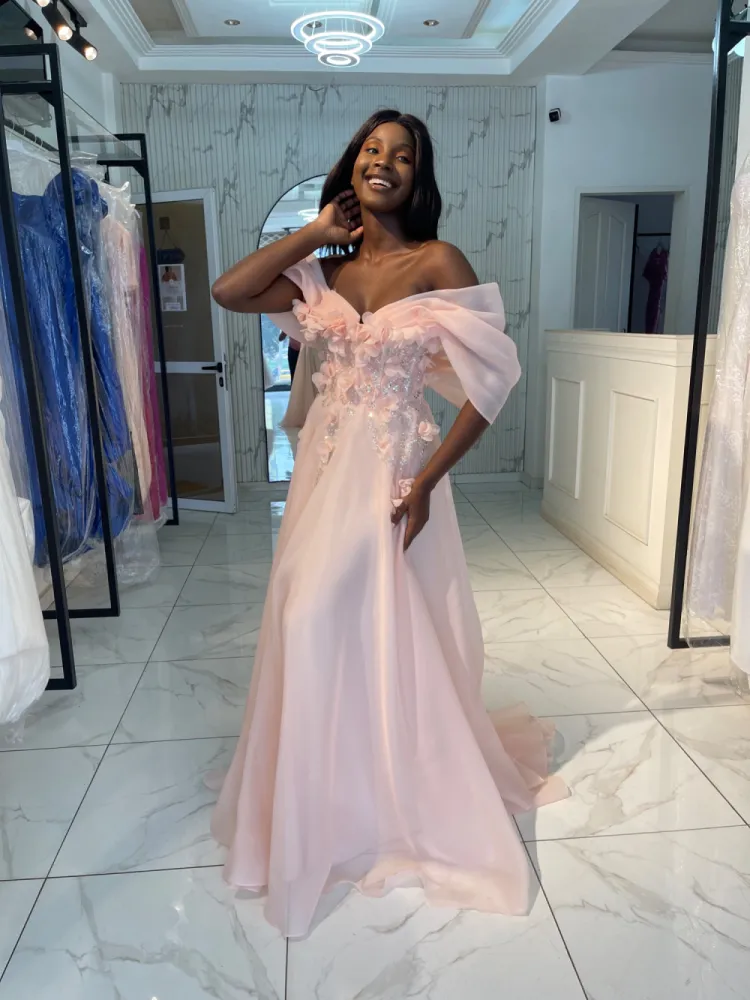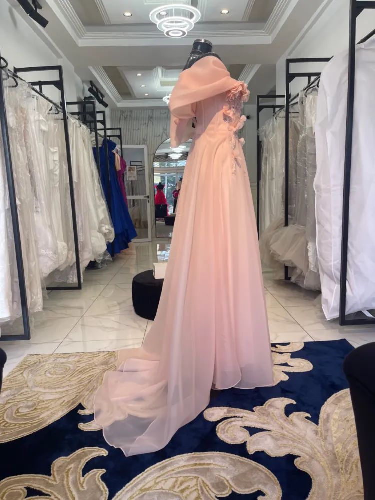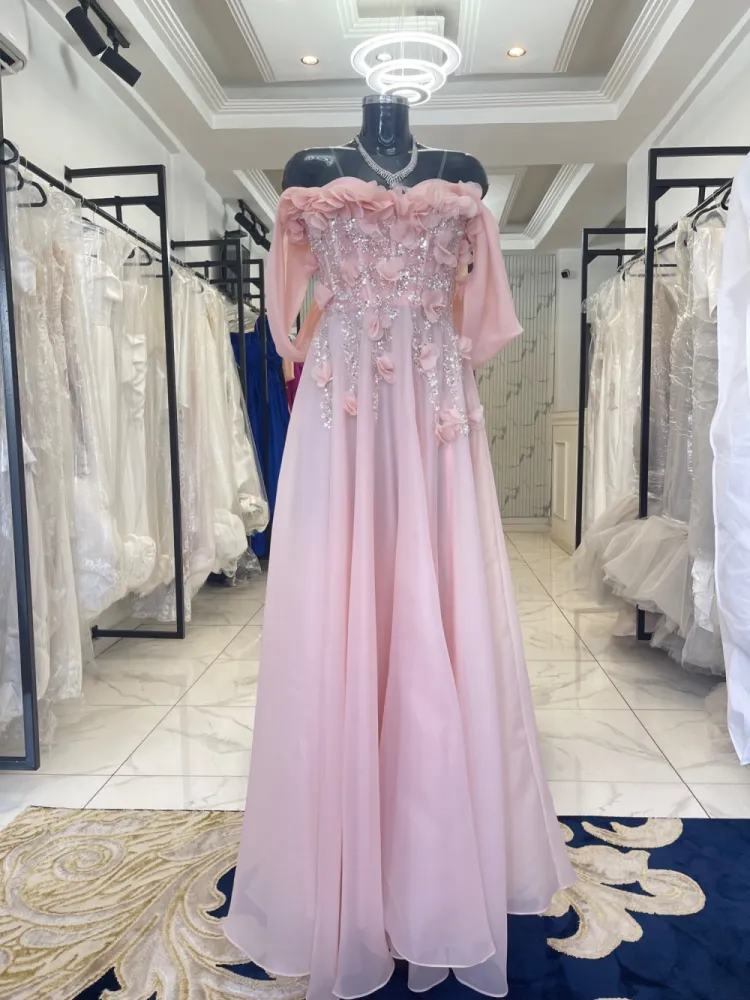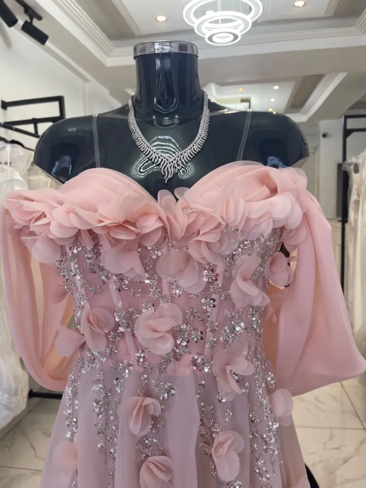 Robe longue rose poudré avec strass sur le bustier et les fleurs , manches bateau
